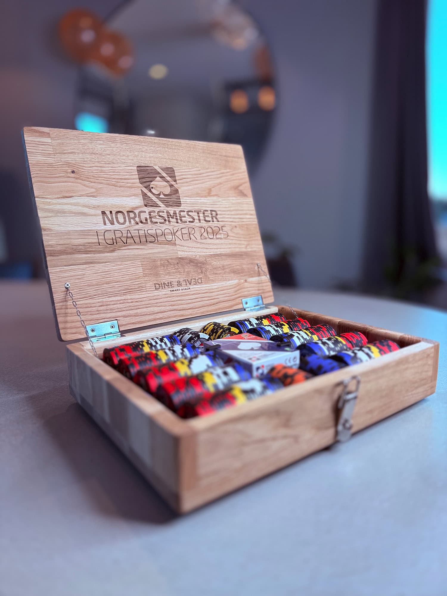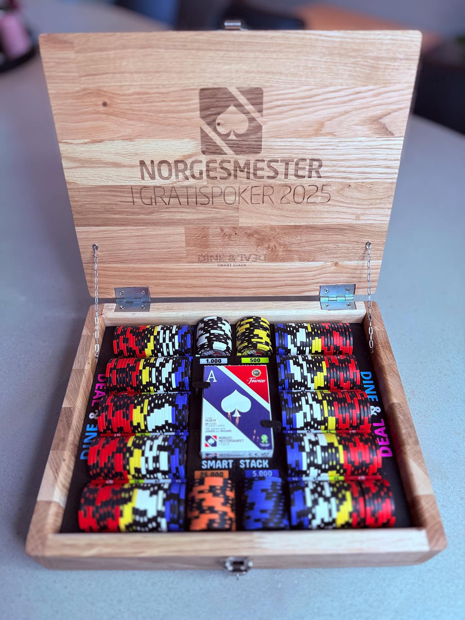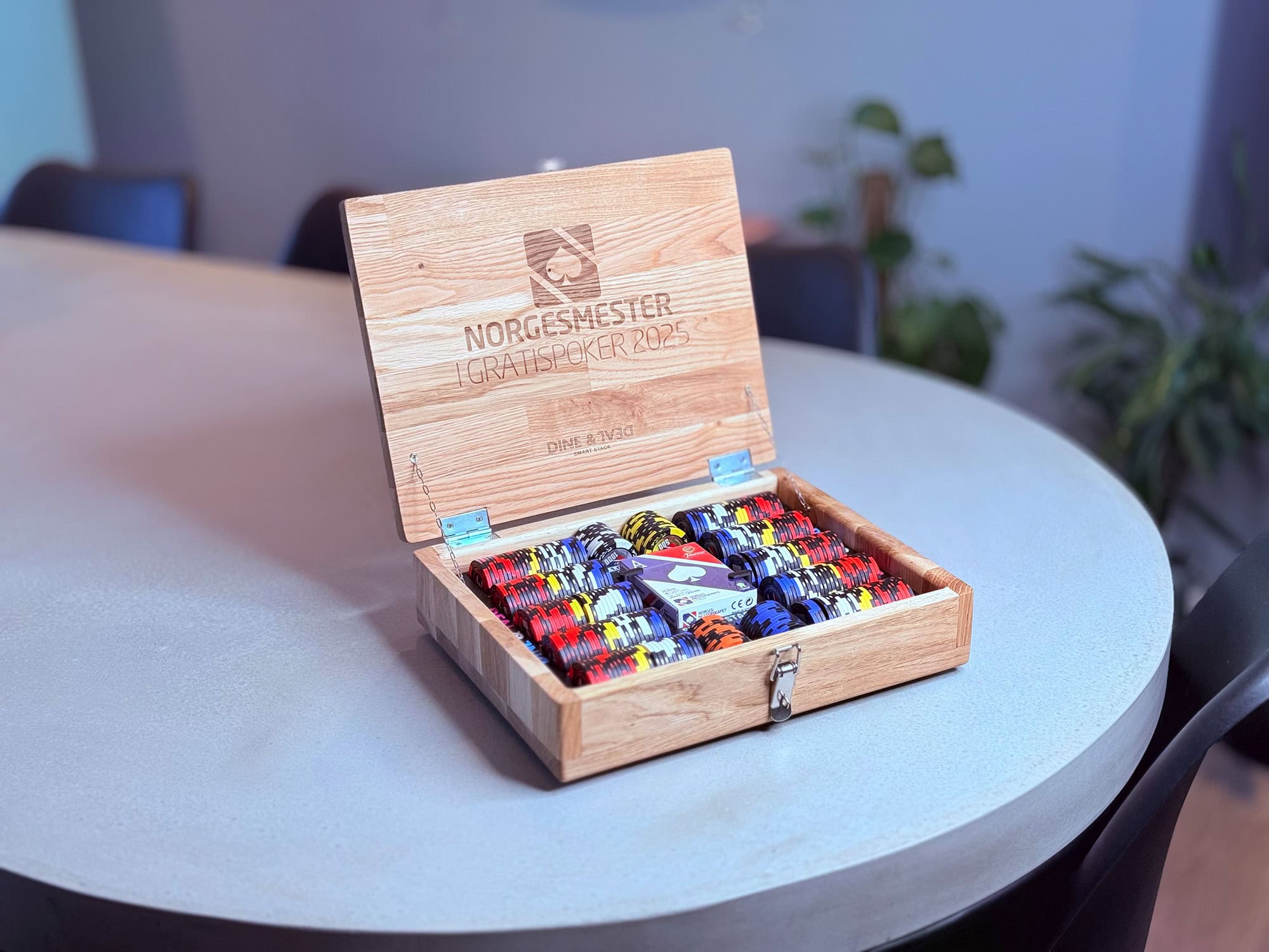 Kofferten er lasergravert med tittelen «Norgesmester i Gratispoker 2025», så dette er absolutt et unikt trofé å jakte på.
