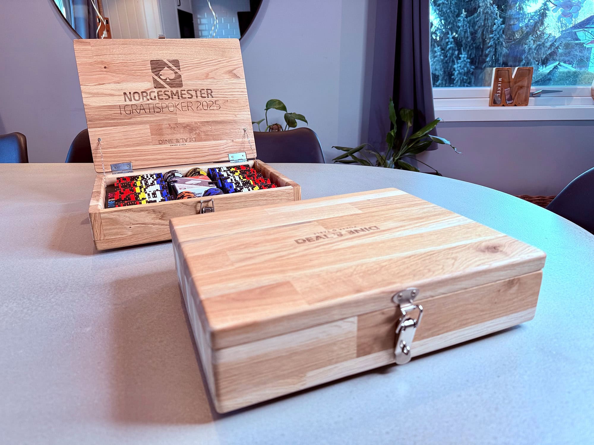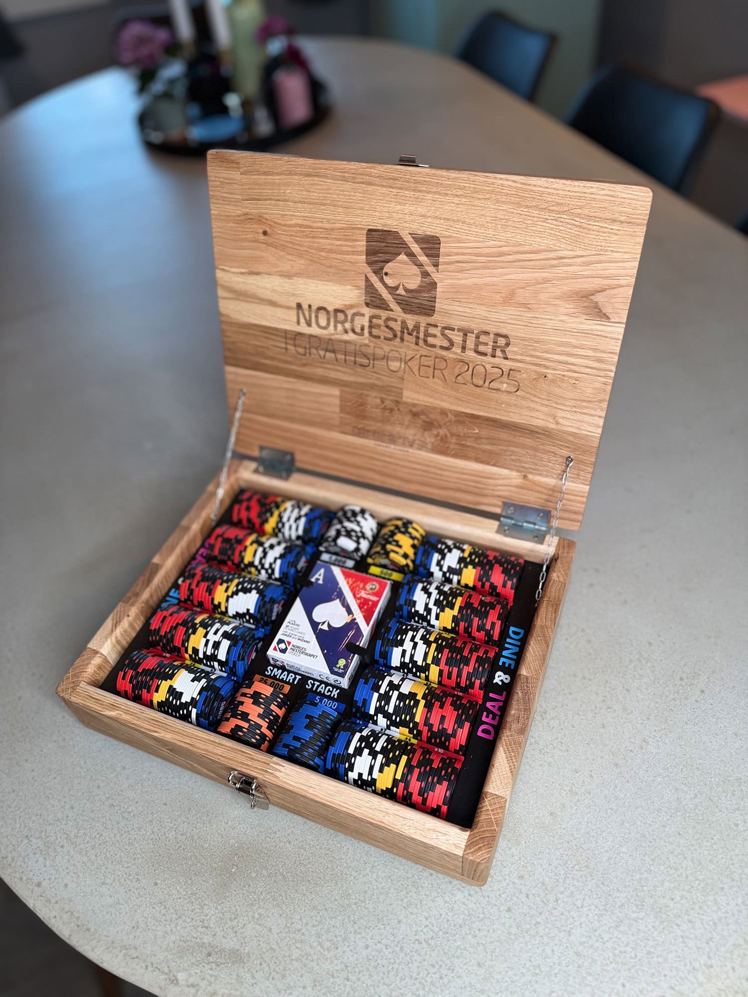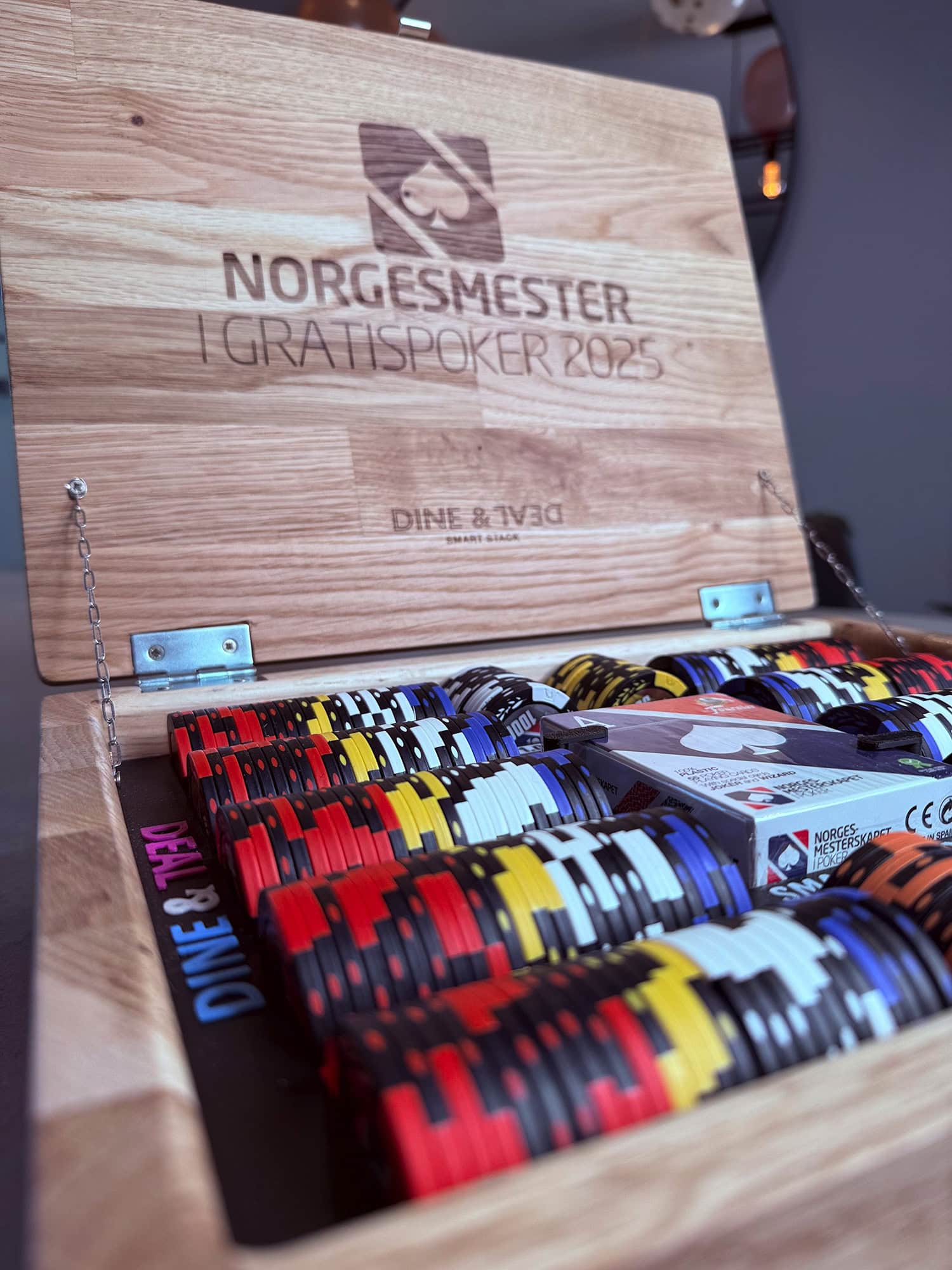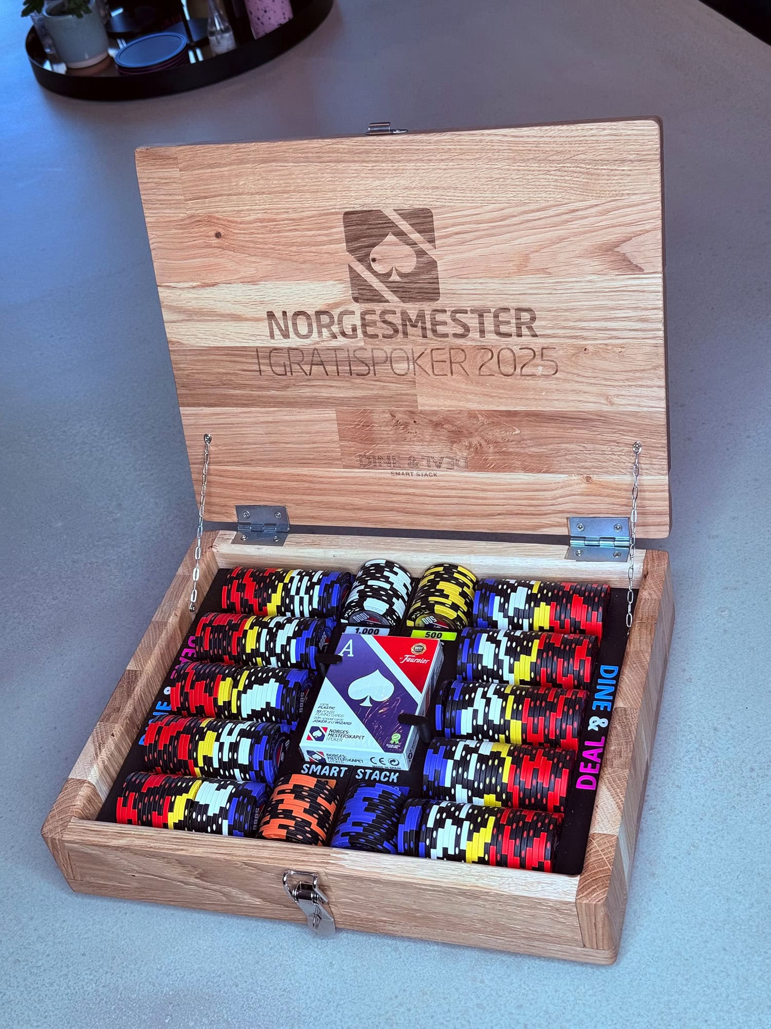 Kofferten er lasergravert med tittelen «Norgesmester i Gratispoker 2025», så dette er absolutt et unikt trofé å jakte på.