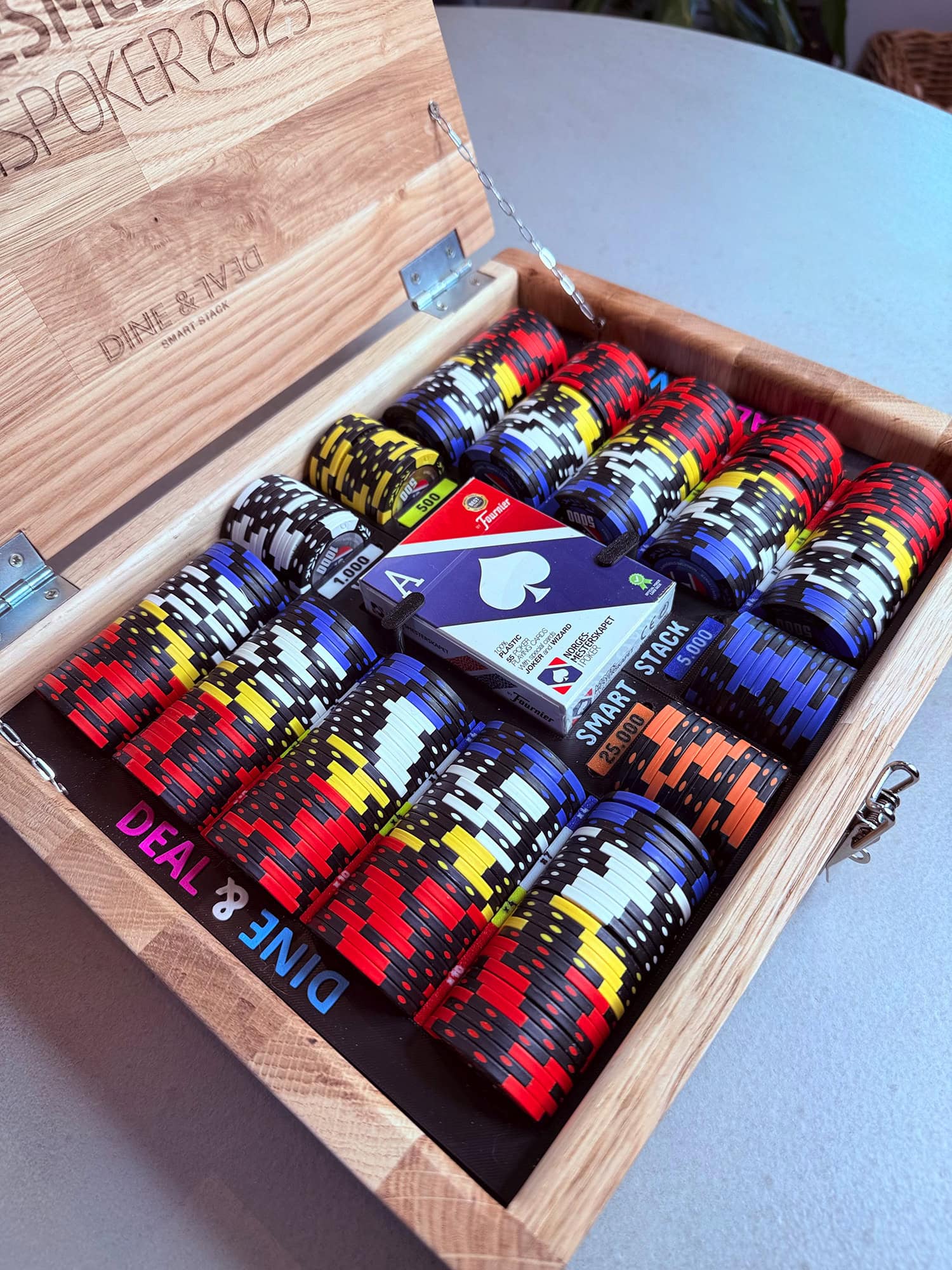 1 stk eksklusiv og håndlaget «Smart Stack» pokerkoffert i eik, komplett med chips og utstyr.